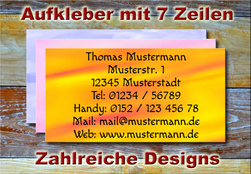 Selbstklebende Adressaufkleber mit zahlreichen tollen bunten Designs zur Auswahl. Die Adressaufkleber sind vollständig selbstklebend. Einfach Aufkleber abziehen, auf gewünschten Gegenstand aufdrücken und fertig. Jeder Adressaufkleber hat individuelle Farbverläufe. Kein Etikett gleicht dem anderen. Wenn Sie sich z.B. das Design Feuersturm ausgesucht haben, so sind auf jedem Adressaufkleber individuelle unterschiedliche Flammenmuster zu sehen. Die Designs 7-12 sind neutral einfarbig gestaltet worden.